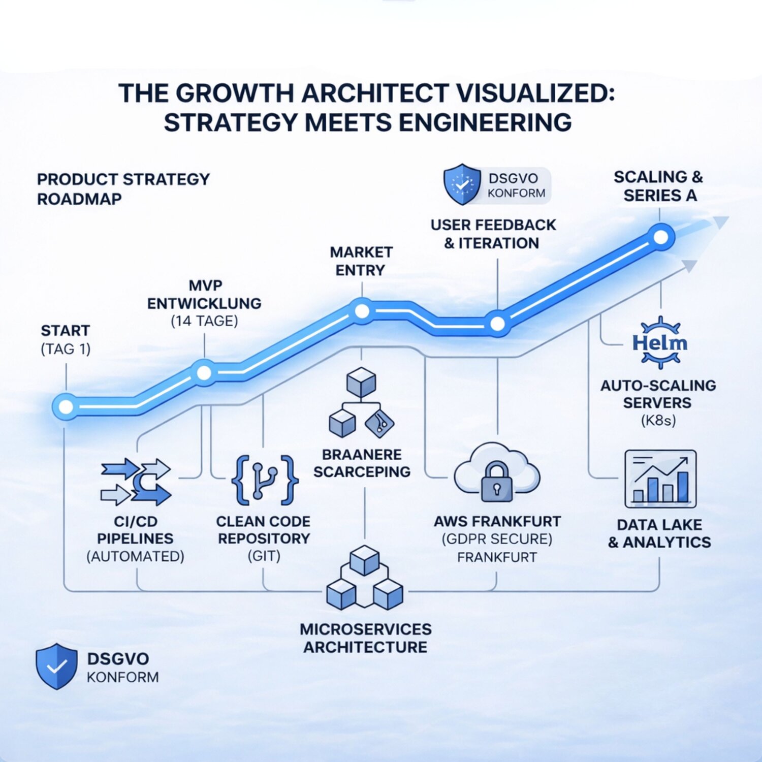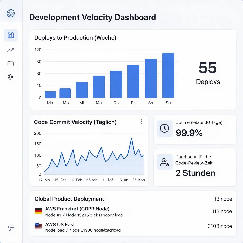 Als Unternehmer wissen wir: Zeit ist der kritischste Faktor. Wir bauen keine Prototypen, sondern skalierbare Tech-Plattformen von Tag 1 an, die Gründer von technischem Ballast befreien.